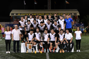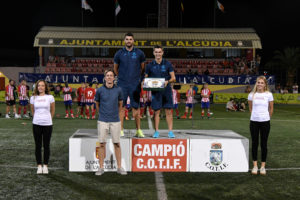 Entrega el trofeu: Eduard Revert, delegat de la Federació Futbol CV, i Josep Miquel Moyà, director general d’Esports de la Generalitat Valenciana.