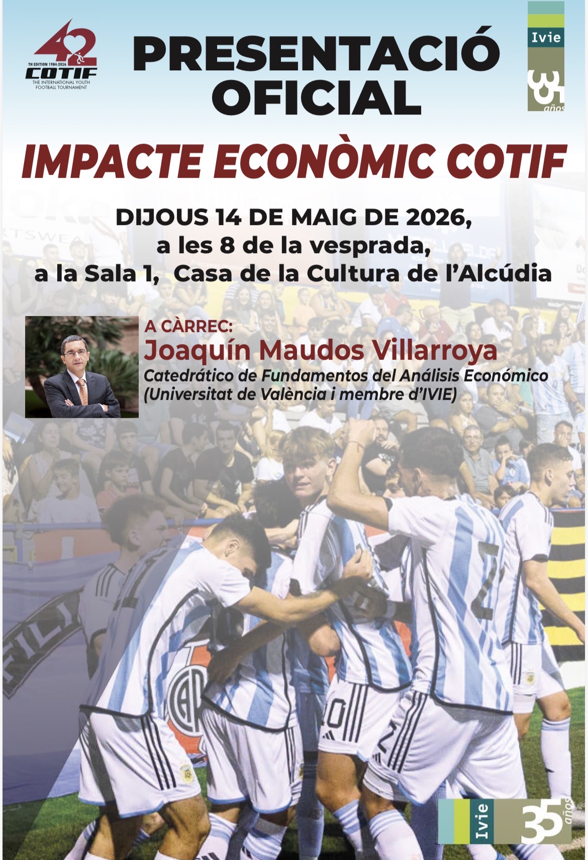 La Casa de la Cultura de l’Alcúdia será el escenario de la presentación oficial del estudio sobre el impacto económico del COTIF, un evento que pondrá en valor la relevancia del prestigioso torneo internacional de fútbol base más allá del ámbito deportivo. El acto tendrá lugar el próximo jueves 14 de mayo de 2026, a las 20:00 horas, en la Sala 1 de la Casa de la Cultura, y contará con la intervención de Joaquín Maudos Villarroya, catedrático de Fundamentos del Análisis Económico en la Universitat de València y miembro del Instituto Valenciano de Investigaciones Económicas (IVIE).