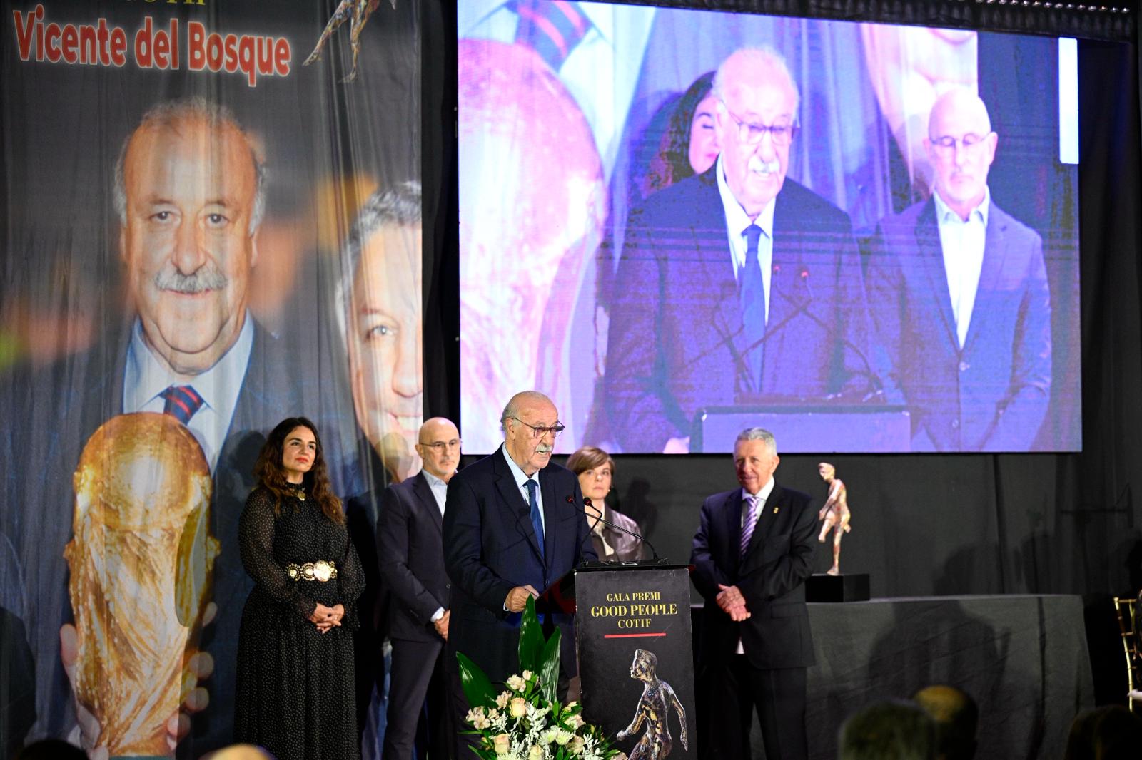 “Pórtate bien”, le espetó su padre cuando la carrera futbolística pareció que podía fructificar. Tenía diecisiete años. Han pasado cincuenta y siete pero Vicente del Bosque nunca lo olvidó. Aquel aprendizaje, aquella consigna, aquella máxima vital sigue presente en él. Sigue portándose bien y por eso el mundo del fútbol homenajeó ayer a una persona que, por muchos reconocimientos que recoja, siempre merece uno más. Vicente del Bosque recibió en l’Alcúdia el Premio Good People COTIF que ponía en valor la promoción innegociable de los valores positivos del deporte que durante su trayectoria profesional e incluso durante vida más allá de los focos realizó y realiza el ex seleccionador que llegó a ser campeón del mundo con España. Una infinidad de representantes de todos los ámbitos del mundo deportivo, cultural, social o empresarial se reunieron en una gala que agasajó al salmantino, que se suma a la prestigiosa nómina de premiados. Fue el caso del actual entrenador de España, Luis de la Fuente; o el presidente del Consejo Superior de Deportes, José Manuel Rodríguez Uribes.
