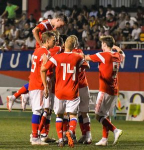 Rusia: 23 Grigorian; 3 Zakharov, 4 Diveev, 6 Kakkoev, 7 Tsypchenko (20 Umaev, m. 73), 9 Lipovoi (8 Glushkov, m. 78), 11 Kiselev, 14 Demianov, 15 Glushenkov (Karpov, m. 73), 17 Iakovlev y 18 Gubanov.