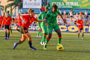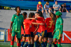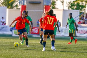 En la primera parte las africanas apostaron en reiteradas ocasiones por tirar la línea de fuera de juego en cada lance, una decisión que las condenó ante un rival mejor en el apartado técnico y físico. Era un partido abierto, España aprovechaba las bandas y los huecos para percutir. La lluvia de goles no tardaría en llegar.