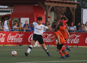El pitido inicial del colegiado dio paso a una auténtica batalla sin cuartel. Quizá la más vistosa de esta edición del COTIF Promesas Istobal debido a la ambición de ambos equipos, llamados a liderar el grupo A. Por ello, en ese esperado choque de trenes entra la Selecció de l’Horta y el Valencia, el ataque tomó todo el protagonismo. Los entrenadores, mientras, se desgañitaban desde las banquetas insistiendo en la tranquilidad. Y cuando todo parecía indicar que las aguas volvían a su cauce apareció la -hasta el momento- estrella del Valencia. Amín Rachid, que en un primer momento había errado en el mano a mano frente a Izan Navarro, no falló la siguiente oportunidad que tuvo y estrenó el marcador. A partir de ese momento, los locales, que iban por debajo en el luminoso, le dieron un aire diferente al duelo, algo parecido a esa brisa de levante que te llega en estas fechas veraniegas. Adelantaron todas sus filas y empezaron a probar la portería blanquinegra, aunque sin fortuna, llegando al descanso con el mismo resultado (0-1).