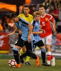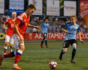 El marcador no se movió en ningún momento, pese a que ambos equipos mostraron su garra y tuvieron ocasiones de sobra para que el resultado final fuera otro. Se enfrentaban dos equipos invictos hasta la fecha y así continuaron tras el empate sin goles. Ambas selecciones dejaron patente sobre el terreno de juego por qué son dos de los mejores equipos de este COTIF (ambas estaban clasificadas para semifinales antes de que el cuero echara a rodar) y salieron a por el triunfo. Si bien destacaron tanto en la faceta ofensiva como en la defensiva, fue Uruguay la que creó más peligro durante los primeros minutos. Dávila envió el balón fuera tras cazar un mal rechace de la defensa rusa. Más tarde, Vecino, a la media vuelta, tampoco acertó de cara a puerta. De nuevo, los suramericanos tuvieron una magnífica ocasión en las botas de Dávila, que encaró hacia el centro desde la derecha, pero su disparo se marchó cerca del palo. Rusia trenzó buenas jugadas, aunque muchas de ellas ni quiera culminaban en un remate. Sí lo hizo, no obstante, Kiselev, que desde la izquierda realizó un magnífico lanzamiento que Silveira detuvo. Tsypchenko también pudo adelantar a los suyos tras una gran jugada de Lipovoi por la izquierda, que remontó la línea de fondo y cerca estuvo de dar una estupenda asistencia a su compañero. Los rusos han interiorizado el juego de toque y se nota que han desarrollado un enorme trabajo para conseguir engarzar un equipo coral, bien equilibrado en todas sus líneas.