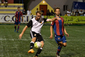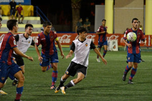 El choque se inició con retraso debido a una tromba de agua que descargó con fuerza en las instalaciones de Els Arcs. Un factor que dejó helados a los dos equipos y que propició que les costara entrar en el partido. Tanto valencianistas como levantinistas estuvieron espesos hasta que Carlos Pérez, mediocentro blanquinegro, decidió erigirse como protagonista y convertirse en líder de los suyos imprimiendo una marcha más al juego de los suyos. Fue un punto de inflexión porque, a partir de ese momento, el Valencia CF se convirtió en dueño y señor del partido. Esa imposición táctica se tradujo en el primer gol del partido. Lo logró Exteso en una acción de delantero puro tras anticiparse a su defensor después de un centro de Antonio. Con la ventaja a su favor, los de Miguel Grau se sintieron mucho más cómodos y acamparon a sus anchas sobre el terreno de juego. Antes del descanso, Pablo Jiménez pudo aumentar las diferencias, pero solo fue un aviso que sirvió de antesala a lo que vendría en el segundo acto.