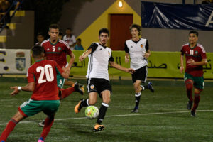 Empezó muy alegre la selección magrebí, aupada -como en cada partido- por su fiel y animosa afición, que acompañó al combinado nacional con sus enérgicos cánticos. Marruecos llevaba la batuta ofensiva, mientras que el Valencia respondía con una gran defensa y rapidísimas salidas a la contra. Karim pudo adelantar a los norteafricanos a los 20 minutos con un disparo cruzado desde el borde del área derecho que se perdió fuera por poco. El propio atacante rozó de nuevo el primero del partido al no poder rematar el pase de la muerte en el área pequeña. Y, cuando mejora estaba la selección norteafricana, Pablo Jiménez recibió un buen balón dentro del área para cruzar certeramente la pelota dentro de las mallas de la potería defendida por Mehdi. El propio Jiménez se fabricó una jugada individual minutos después, pero su lanzamiento desde la frontal se perdió desviado. Replicó Hassan para los africanos, con un magistral regate que le dejó delante del cancerbero. Sin embargo, su disparo se marchó desviado. Sí atinó un minuto después Yassine, quien se incorporó dentro del área para enviar su disparo a la escuadra. El empate hacía justicia en el marcador y, dos minutos después, los jugadores enfilaron el túnel de vestuarios.