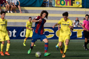 Los primeros instantes fueron de dominio alterno, con las dos formaciones valencianas llegando hasta el área contraria, aunque sin crear excesivo peligro. Solo una falta lanzada por el azulgrana Puertas y la posterior réplica de Galdón para los groguets amenazaron el empate sin goles inicial. El conjunto de Javier Prats fue adueñándose de la pelota poco a poco, mientras los levantinistas se limitaban a esperar a su rival y a defender con orden. Los castellonenses protagonizaron una jugada trenzada que no encontró rematador por poco, e instantes después los granotas llegaban al marco rival gracias a una galopada de Fabra y el posterior remate de Pitu. Al filo del descanso, no obstante, llegó el primer tanto, obra del levantinista Christian. El joven azulgrana bajó al suelo el esférico para driblar a un defensor y enviar su disparo dentro de las mallas, pegado al poste.