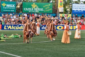 Con una alegoría sobre la agricultura y la idiosincrasia del pueblo valenciano echó ayer a rodar la trigésimo cuarta edición del COTIF, el torneo internacional de fútbol que todos los veranos se disputa en l’Alcúdia. Miles de personas se dieron cita en la ceremonia inaugural, en la que participaron todos los equipos que competirán hasta el día 11 de agosto en las diferentes modalidades del torneo: el campeonato sub-20, el femenino y el Promesas Istobal. El acto estuvo dirigido artísticamente por el coreógrafo José Tomás, un asiduo en la dirección de la gala alcudiana que todos los años consigue llenar el césped de Els Arcs de colorido, tradición, fiesta e identidad. Los inicios de la civilización árabe, que tantos vestigios acabó ofreciendo a la identidad peninsular, supusieron el arranque de la historia, con el trasfondo sobre la importancia de mantener las raíces identitarias para encontrar un rumbo en la vida de los pueblos. La escenografía fue posible gracias al Ballet Òpera de Ontinyent, el Ballet Gawazi de Alcoi y la Muixeranga Els Negrets de l’Alcúdia, con cientos de intérpretes sobre el tamiz verde.